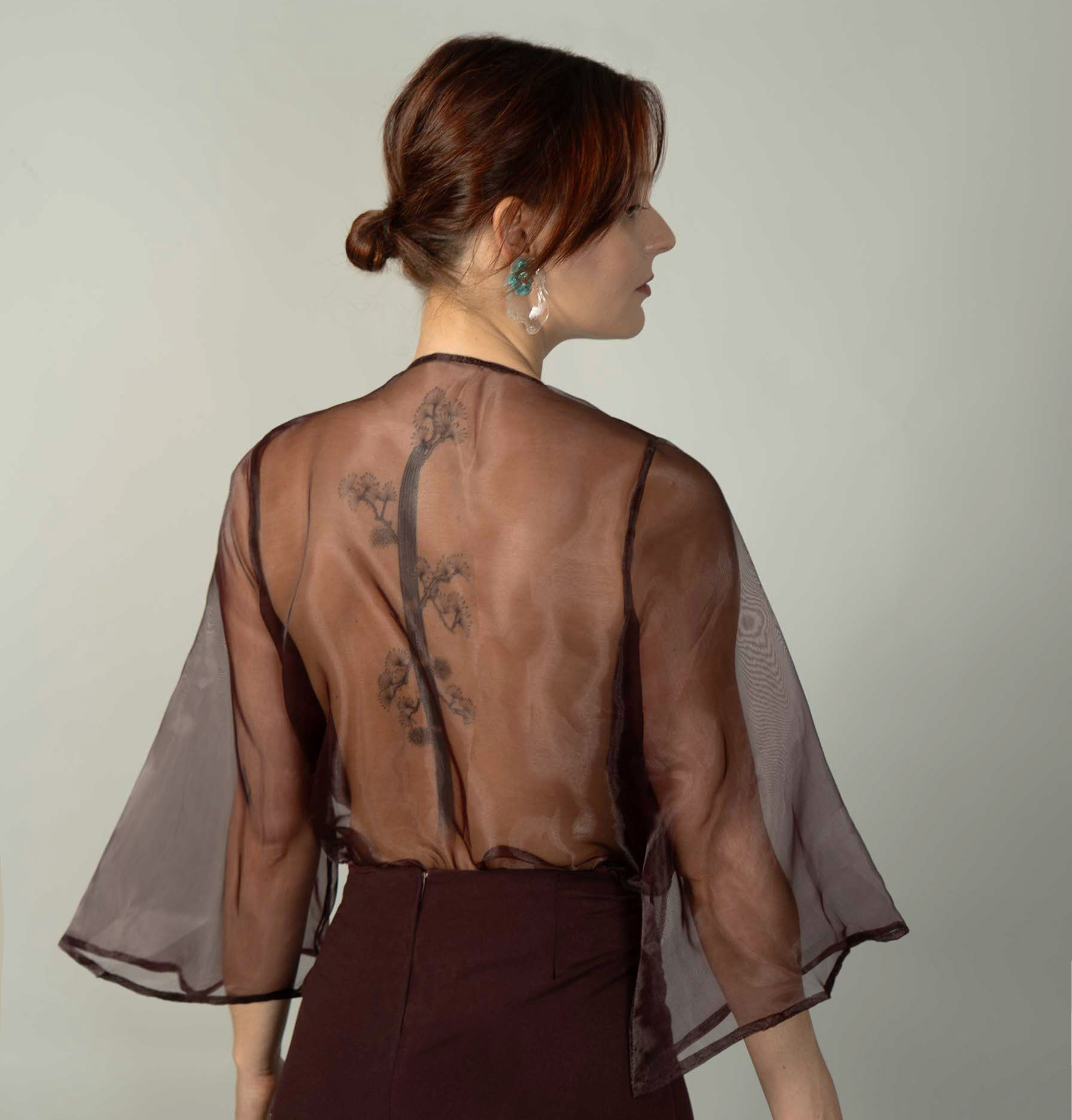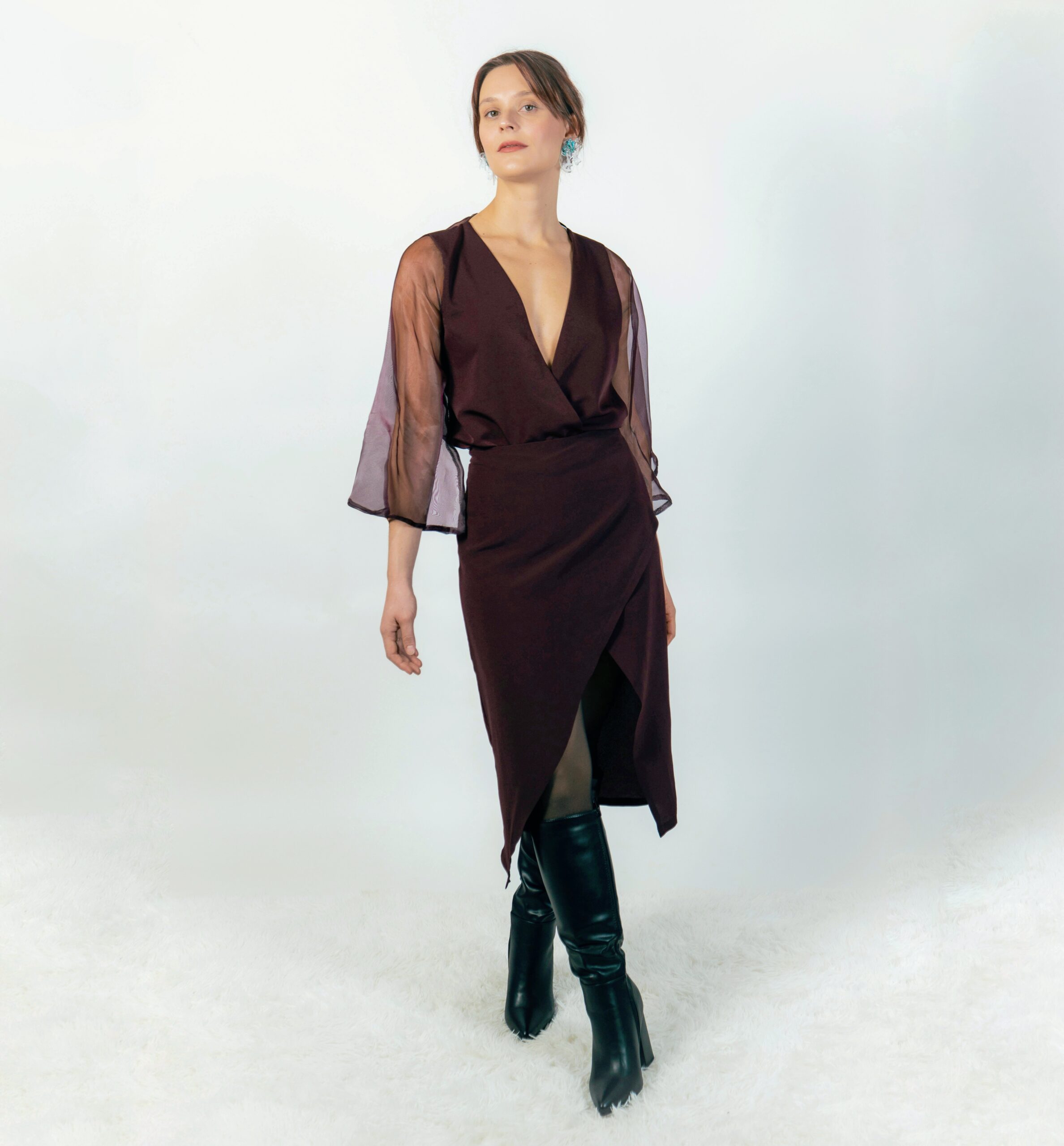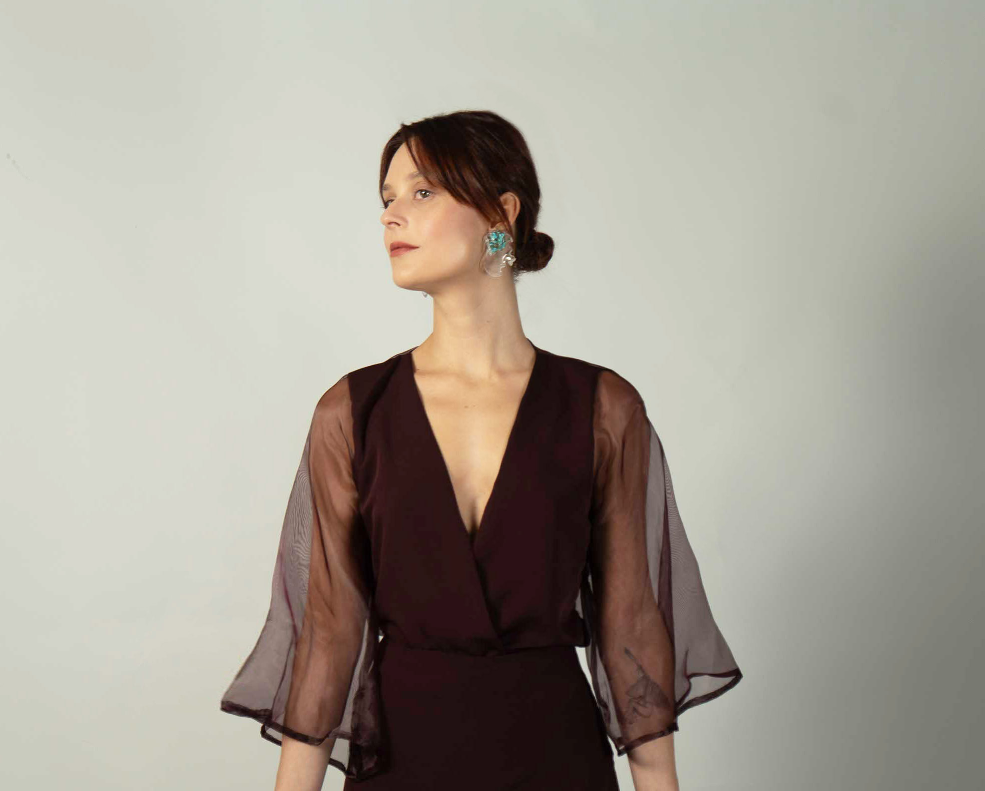 Body escote cruzado en V, con mangas campana transparentes en muselina vaporosa. Está confeccionado en Creep channel que aporta estructura con un acabado mate y elegante caída. La espalda, también en muselina, revela una transparencia sutil que equilibra delicadeza y diseño, la parte inferior es confeccionada en Lycra algodón 100% , garantiza comodidad y adaptabilidad al cuerpo, e incorpora broche de cierre para facilitar su uso.