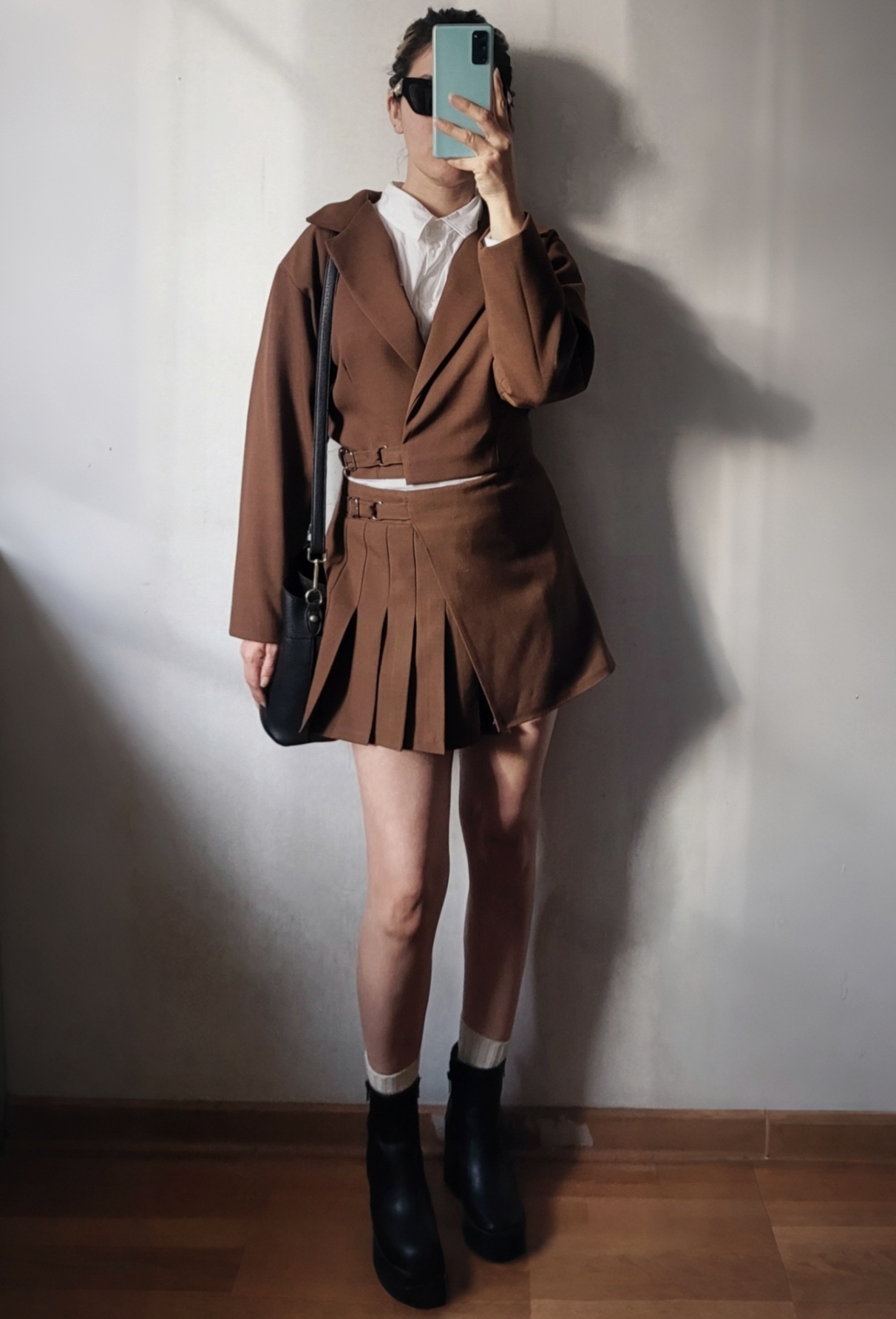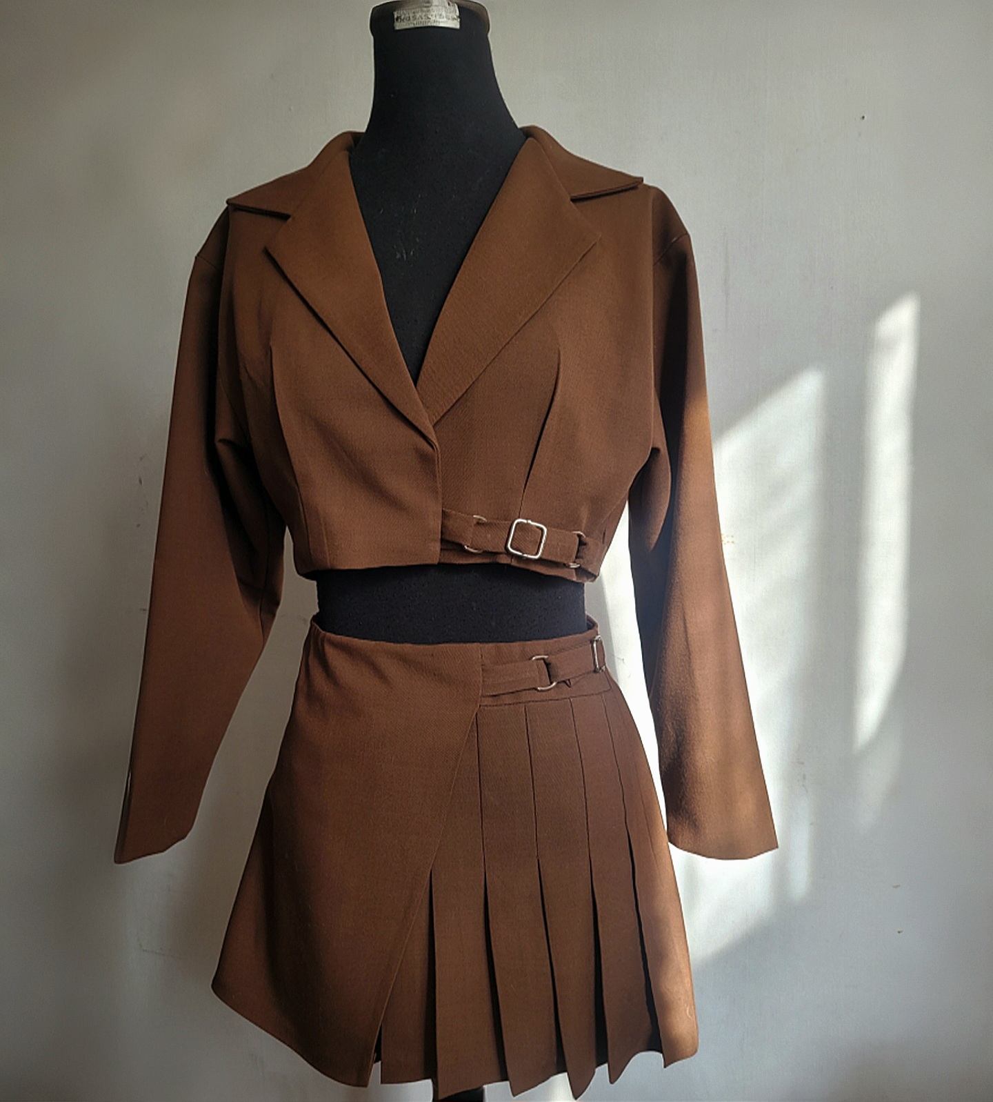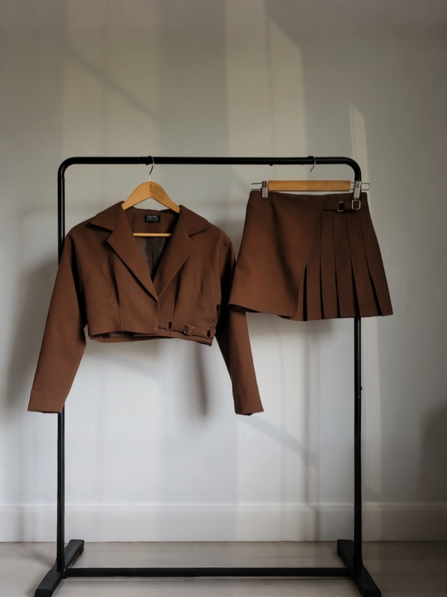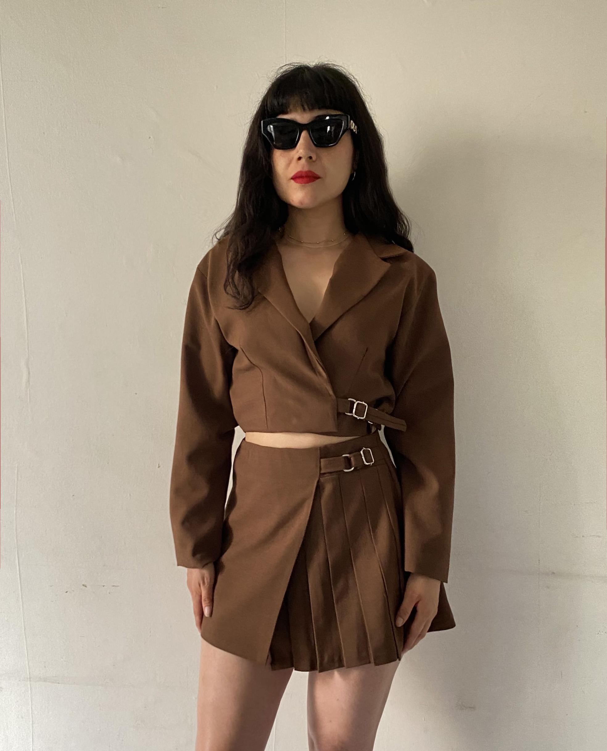 Chaqueta tipo sastre color Mocha Mouse – Cropped Fit / Esta pieza tipo blazer es una versión más desestructurada y contemporánea de sastrería. Su corte cropped y hombros suavemente amplios reinterpretan el blazer clásico en clave juvenil y actual. Confeccionado en 100% Casimir, tela noble combina ligereza y estructura en cada movimiento. Con hombreras y pasadores métalicos transforman la pieza más urbana y de tendencia.