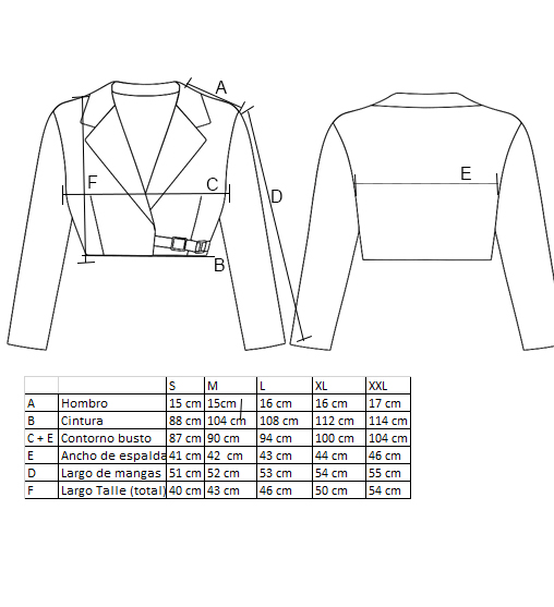 | E | Ancho de espalda | 41 cm | 42 cm | 43 cm | 44 cm | 46 cm |
