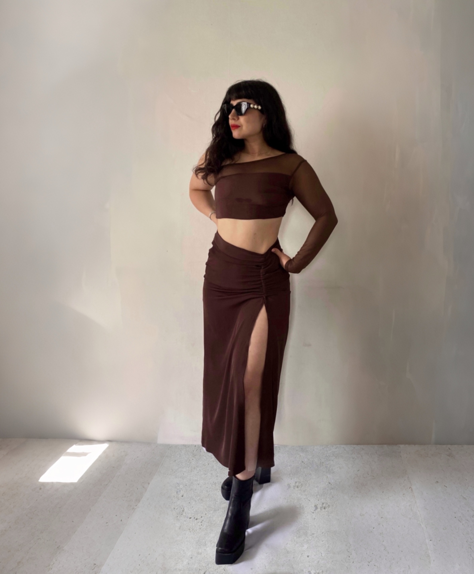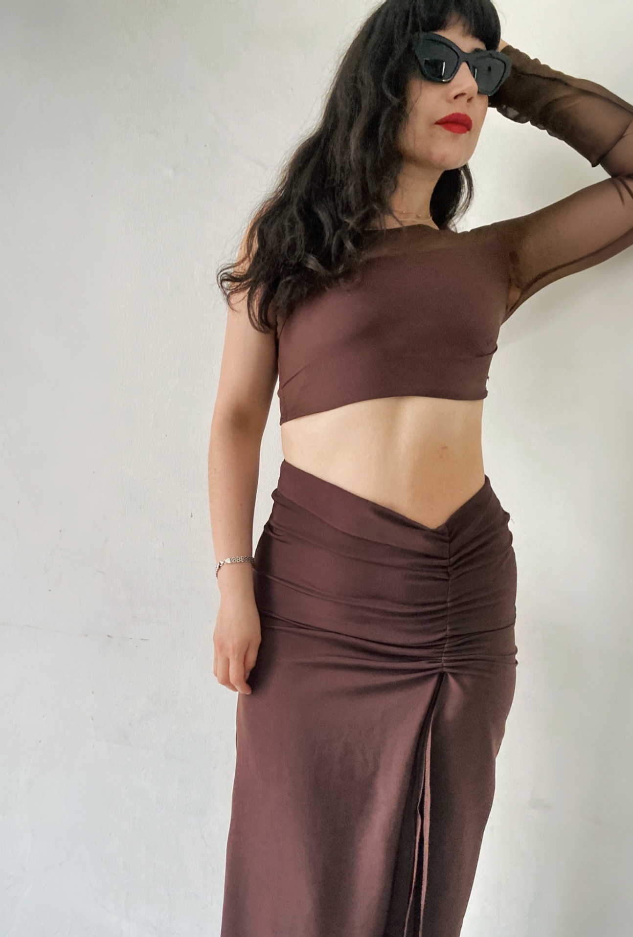 Adelanto colección/ Falda larga creep chanel con lazo para crear efecto drapeado y adaptar la abertura– y crear un efecto asimetric en pretina, cierre invisible espalda, y detalles de basta a mano, que destaca la caída sin costuras y prolijidad. Una falda esencial para usarla de noche con un crop o combinarla con un polera básica y usar de día casual.