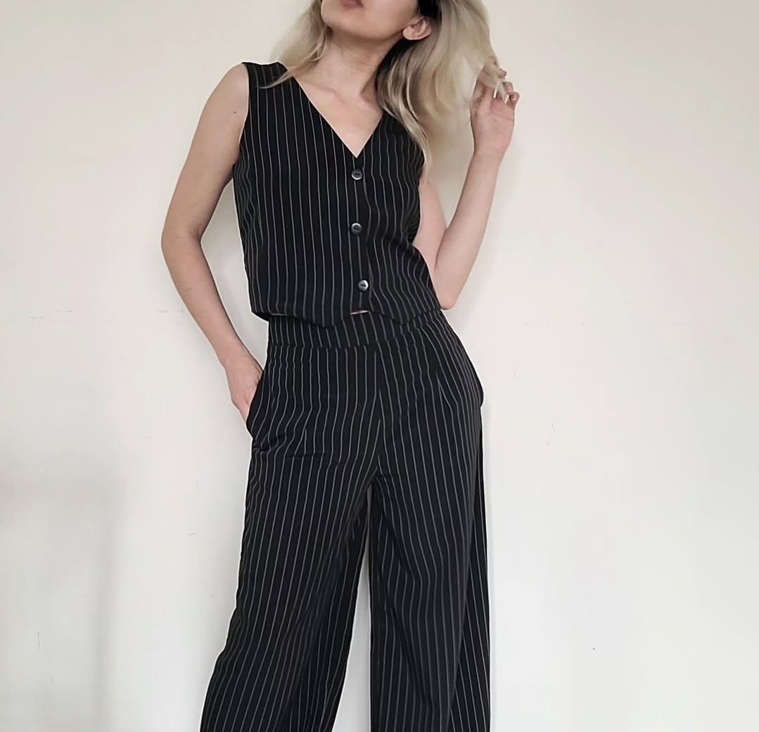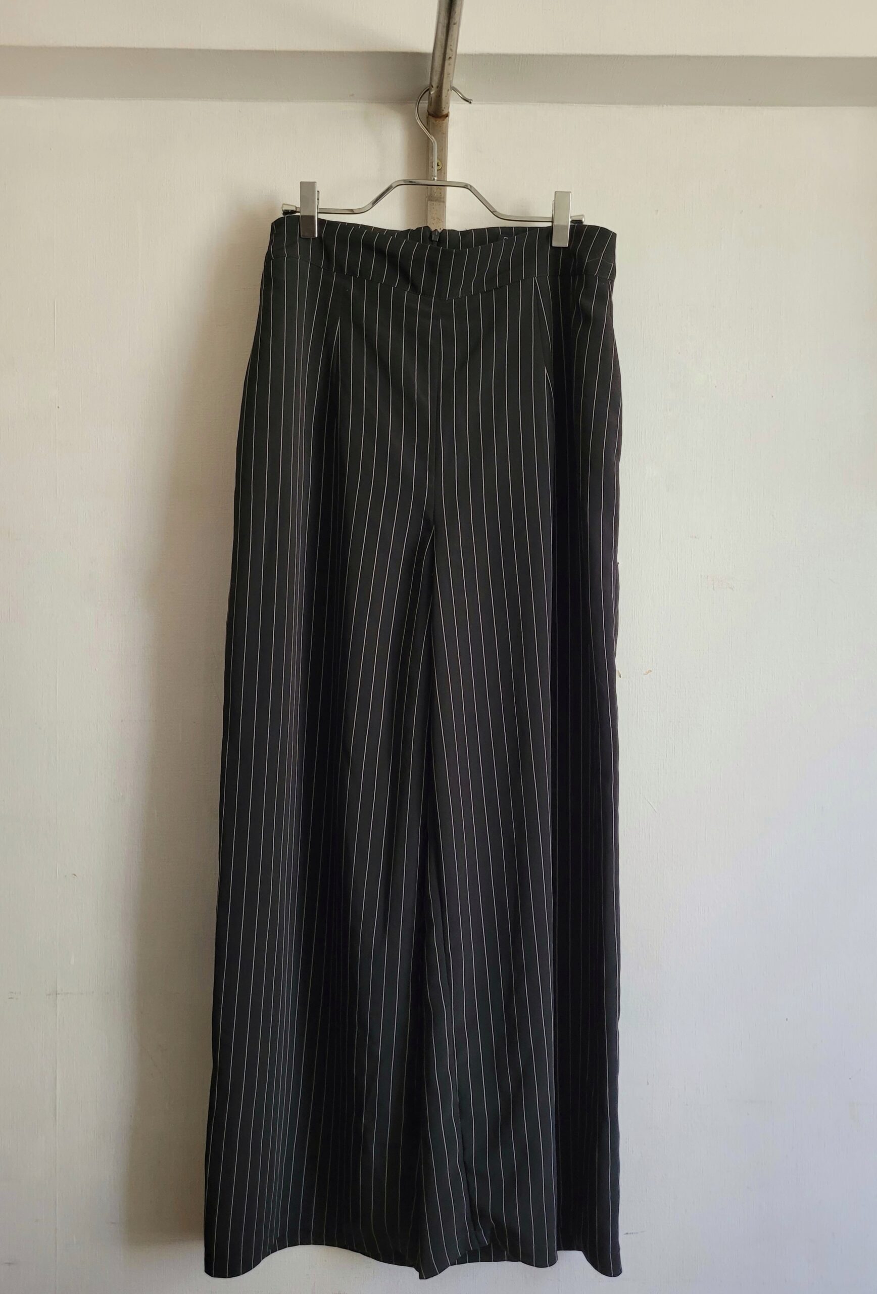 Pantalón Palazzo  con bolsillos laterales en tela creep chanel de rayas , con cierre invisible y 2 pinzas en cada costado del delantero